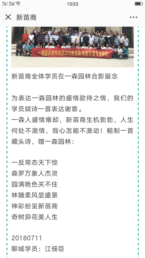 下面附上新苗商學(xué)員的藏頭詩(shī)一首:感謝新苗商學(xué)員對(duì)一森園林的贊譽(yù)