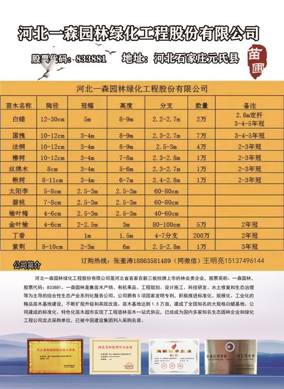 此次會(huì)議由河北省林木種苗協(xié)會(huì)主辦,一森園林公司承辦,支持媒體有《中國(guó)花卉報(bào)》、《中國(guó)綠色時(shí)報(bào)》和元氏電視臺(tái),參加會(huì)議的技術(shù)專(zhuān)家有河北省科技廳農(nóng)村處處長(zhǎng)徐成、河北省林業(yè)和草原局國(guó)有林場(chǎng)和林木種苗管理處處長(zhǎng)張錦成、河北省林業(yè)和草原局科技處副處長(zhǎng)劉新、石家莊市科技局農(nóng)村處處長(zhǎng)高少軒、石家莊市科技局市科技局法規(guī)處副處長(zhǎng)趙春杰、元氏縣科技局局長(zhǎng)李旭樓、河北省林木種苗協(xié)會(huì)會(huì)長(zhǎng)汪民、協(xié)會(huì)副會(huì)長(zhǎng)、河北一森園林綠化工程股份有限公司董事長(zhǎng)耿軍林、專(zhuān)委會(huì)主任河北農(nóng)業(yè)大學(xué)園林旅游學(xué)院院長(zhǎng)黃大莊、副主任委員河北農(nóng)業(yè)大學(xué)林學(xué)院教授、博士生導(dǎo)師楊敏生、河北省林業(yè)和草原科學(xué)研究院黨委書(shū)記、教授級(jí)高工王玉忠等人。