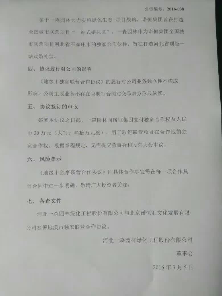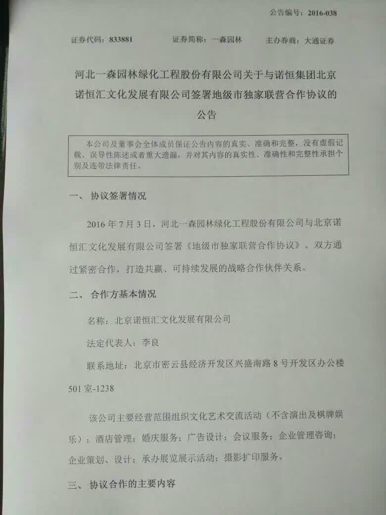河北一森園林綠化工程股份有限公司關(guān)于與諾恒集團(tuán)北京諾恒匯文化發(fā)展有限公司簽署地級市獨家聯(lián)營合作協(xié)議公告